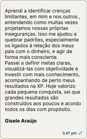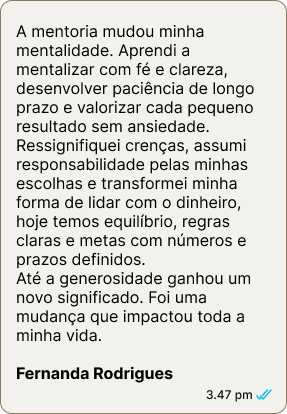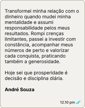 Você aprende a alinhar as finanças do casal, curar comportamentos tóxicos e construir um legado consciente de segurança e abundância.